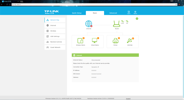 To start off, connect your device to the TP-Link Archer C3150. While it is not necessary to have internet access, you will need it to ensure you have the latest firmware updated. You can then navigate to the device's web configuration interface on your computer, through your browser of choice. Upon first login, you will go through a quick setup, which allows you to set initial settings. Alternatively, you could download the TP-Link Tether app from Apple App Store or Google Play. The Tether app generally provides the same basic configuration settings, but we will be stepping through the web browser option in this review.