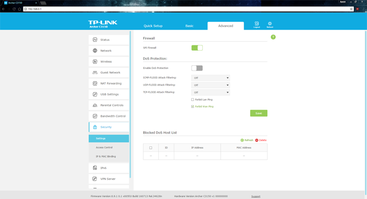From the Security tab, you can change the firewall settings, including setting up Stateful Packet Inspection, which is pretty standard. Other things you can enable are DoS protection, while changing access control for devices and modifying IP and MAC bindings are on other tabs.