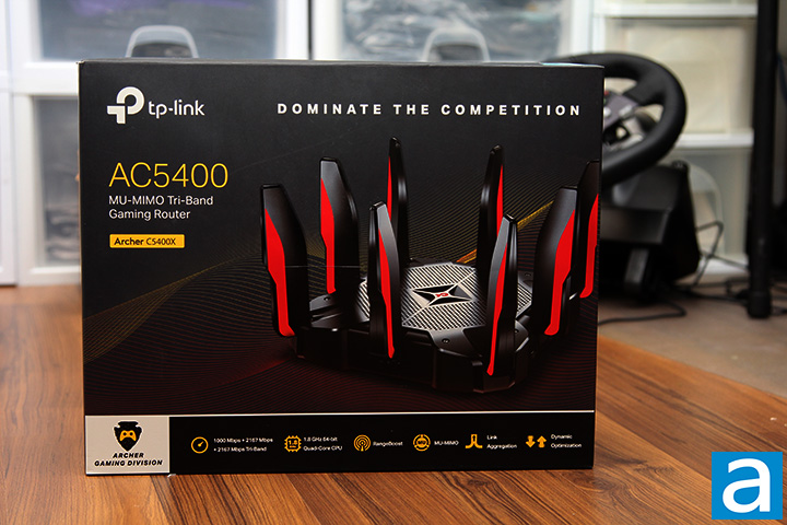 Like the overwhelming majority of products we get here at APH Networks for review, TP-Link sent us their router in its retail packaging. The predominantly black box accentuates the gaming theme, which you can see in our photo above. In the middle, you will find a three-quarters view of the TP-Link Archer C5400X router occupying some prime real estate. The product description, "AC5400 MU-MIMO Tri-Band Gaming Router", is printed above the Archer C5400X model tag. Along the bottom is an array of five icons providing some highlights of this product, which is its tri-band operation, 1.8GHz 64-bit quad core CPU, RangeBoost, MU-MIMO, Link Aggregation, and Dynamic Optimization. TP-Link's logo is placed at the top left corner, while the slogan "Dominate the Competition" fills in the remainder of the space on top. The remaining sides of the box has more feature highlights and specifications.