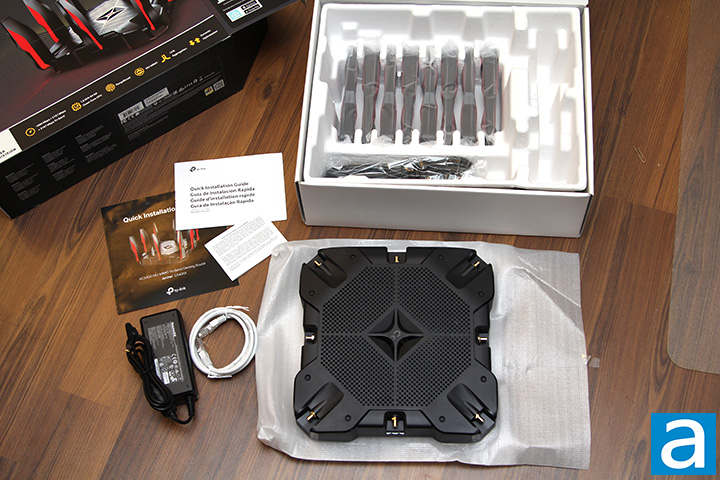 A cardboard tray slides out of the side of the thin cardboard cover of the TP-Link Archer C5400X's retail package. I am a fan of the environmentally friendly packaging, especially considering my disdain for squeaky foam brackets that I have thankfully not seen in a long time, haha. Out of the box, you will receive the following:
