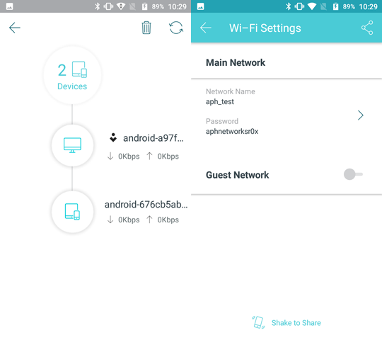 Before doing so, you can tap on the devices button on the front, which displays all the wired and wireless devices connected to the network. This will also show the current instantaneous upload and download speeds of each device. When you tap on the device, it will then show more information including the local IP address and MAC address. On the right screenshot is the Wi-Fi Settings page, where you can configure the SSID and encryption key. There is only one setting for both the 2.4GHz and 5GHz network, and choosing between the two is done automatically. I find it interesting the password is not actually hidden here, which is generally the norm for most passwords. A guest network can be setup here if you desire. You can also shake your device here to share your main or guest network with other users.