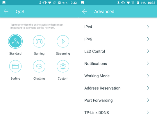 On the QoS page, this is where you can prioritize certain types of traffic over others for different devices. This is not limited to specific applications and is generally a primitive system, but it is also easy to use. Instead, it groups types of activities and prioritizes certain categories over others. On the Advanced page, you can see we have even more options available here. IPv4 and IPv6 is where you can adjust the WAN settings for both protocols. LED Control is where you can turn off the LED on all of the Deco M5 nodes over a certain time period, such as the night time. Notifications allows you to adjust the types of notifications you receive from your phone, such as when a new device connects to your network. Working Mode allows you to choose between making the TP-Link Deco M5 act like a router or as an access point to extend the wireless coverage of your current router. Address Reservation allows you to hold certain IP addresses for specific devices. Port Forwarding allows you to set up rules to enable this feature between internal and external ports. Finally, TP-Link DDNS allows you to enable or disable the DDNS, as well as change the domain name if you so desire.