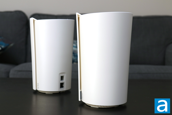 As with most mesh routers, the TP-Link Deco X90 is expected to be placed in a spread-out area around the house for the best distribution of Wi-Fi signal. Thus, these units generally should take up less room and better at hiding into your daily living area. The TP-Link Deco X90 units, however, are a bit larger than what you might expect for a node. In terms of dimensions, each Deco X90 unit is approximately 130mm in width, 123mm in depth, and 210mm in height. These take up quite a bit of space in the open, especially with its taller height. With a flared cylindrical shape, it is not exactly clear that this is a piece of technology unless you take a closer look at it. On first look, it reminded me of a paper towel roll with a hanging piece, but the appearance grew on me over time. As for its construction, the whole unit is made up of a matte white plastic with a glossy area on the top. The white finish looks modern enough to blend into a home environment. On the overlapping areas on the side, there is a TP-Link company logo on one side and a "deco" name on the other. A slim diffuser area houses an LED indicator light near the deco name to indicate the status of that particular unit. This can vary between a solid or flashing yellow, blue, and green color, each with their own meaning depending on the context.