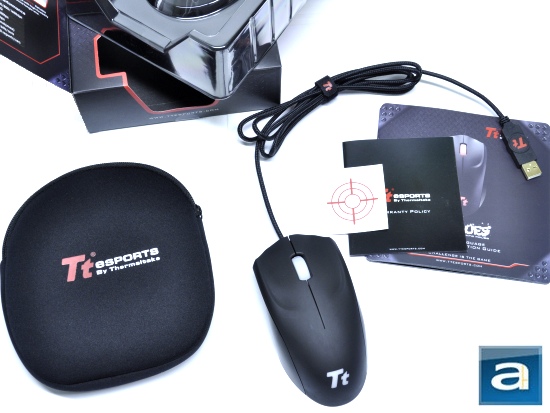 The retail packaging uses a fairly conventional design that opens via the top flap. Once opened, the entire unit and all its accessories can be slid out easily. Accompanying the Azurues, you will find the standard set of components, including the travel bag, owner's manual, and warranty booklet. Also found inside, which is different from other Tt eSPORTS mice, is a transparent cross-hair decal. The main purpose for this decal is not to stylishly decorate your chassis or peripherals, but to actually use it to increase your performance when playing first-person-shooters. How? Well, when you are walking around with a sniper rifle in Counter Strike, you could technically "no-scope" someone by using the transparent decal as a relative aiming guide without an in-game cross-hair. So to use the decal, simply spice up the center of your monitor, and you are good to go. Let's just hope you do not have a problem with having a cross-hair on your monitor for the rest of its life.