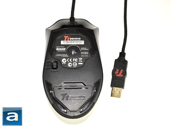 The Azurues optical engine allows one to change the sensitivity from 1600 dpi to either 800 dpi or 400 dpi. With such low dpi numbers, professional gamers are able to easily utilize the precision engine efficiently and effectively during first-person-shooters. The option to change the dpi, however, is located at the bottom of the mouse with a switch, which is simply not efficient or effective. Unfortunately, I find this to be the largest flaw on the mouse, especially with in-game situations where one would need to switch between dpi on the fly for different shooting styles. The bottom dpi switch is, simply put, a small but noticeable failure on the part of Tt eSPORTS.