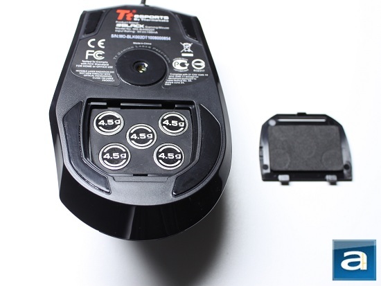 Unlike the Mionix Naos 5000 gaming mouse reviewed by Kenneth back in April of 2010, or the Logitech G9 laser mouse reviewed by Jonathan back in November of 2007, the Tt eSPORTS Black has its set of weights already pre-installed, instead of providing then in a separate tin tray. They can be easily accessed at the underside of the mouse by simply removing the cover that keeps the weights in place. The cover has a somewhat flexible section for users to unlatch the inner hook, which keeps the cover in its place. The Tt eSPORTS Black also houses a rubber tray to keep the weights secured down in proper order without having the weights bouncing around. Of course, if you prefer no weights at all, you can simply remove the whole container. The question is, where in the world could you ever keep weights if no extra tin tray is provided? Luckily, you are provided with a protective soft case out of the box, and within that case contains pouches where you could conveniently place your weights. However, we would appreciate it if more variety of weights were provided to better suite the general population, as there are only five 4.5g weights available from the factory.