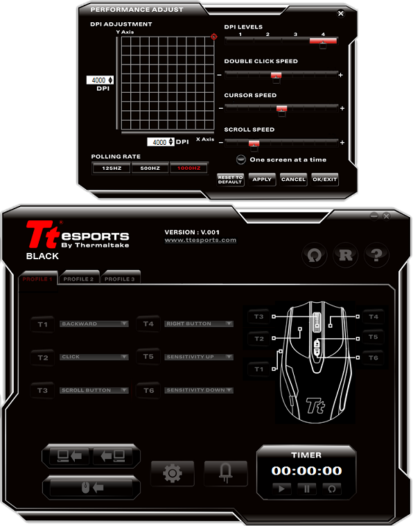 During installation, Thermaltake requires the user to download the driver for Tt eSPORTS Black gaming mouse from their website. The driver software installation took next to no time to complete, as it only requires the user to simply read and click 'next' repeatedly followed by a nice 'Finish' at the end. The provided software is quite plain in looks, but in a sense that it incorporates a sense of slickness and style, which consists of a mainly black background fused with streaks of white along with its white text. The software provided in conjunction with the mouse's 64KB onboard memory allows up to three different profiles for custom button assignments, click speeds, polling rates, scroll speeds, dpi adjustments for both the x-axis and y-axis separately, and lighting options for the logo and scroll wheel, separately. The software also provides you with a means to reset everything to the default settings as well as giving you the option to register your profiles online. Generally speaking, many of these features found in Thermaltake's provided software is quite standard; as what you would expect from a gaming mouse. Features such as independent X/Y axis sensitivity adjustment are one of the most advantageous features of the mouse, as gamers such as Kenneth and I would grow to appreciate for gaming in different situations and styles, and hence, enhances game play in various games. As mentioned earlier, there is also a feature where you could register your profiles online. This gives gamers a variety of perspectives on how other users set their settings on their gaming mouse, and some of them may share similarities, thus, giving you a better understanding of specific settings you should use for your own Tt eSPORTS Black. The software also incorporates a timer at the bottom right of the menu screen for keeping track of the many hours you have spent playing games. However, you have to manually start and stop this timer yourself.