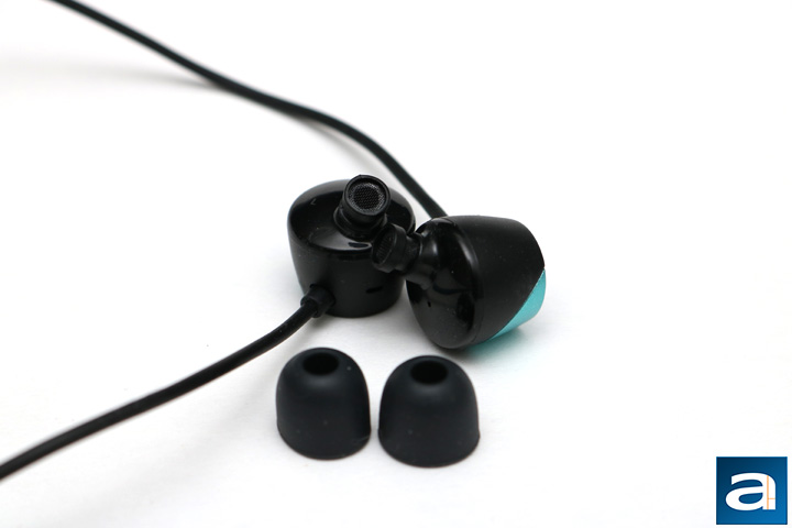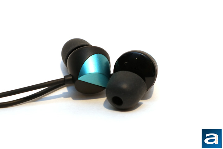 The TUNAI Drum has many colors to choose from. The base color is black and the small little cap can come in different colors. Particularly, there are five: Black, grey, orange, yellow, and blue. As you can see in the above picture, I have the blue version. I appreciate that there are so many different colors, making it flexible for anyone's tastes. The housing is made out of plastic, but it feels solid. The color piece is slightly glossy, while the majority of it has a matte feel. The front bit is quite glossy though. There is no branding on the earpiece at all, except for the L and R on each earbud. Otherwise, the design is a little different than traditional straight earbuds. As you can see, the little earpiece is a little off center. The plastic cable leads out the back of the earbud at the bottom. Because of the plastic design, the TUNAI Drum is quite lightweight.