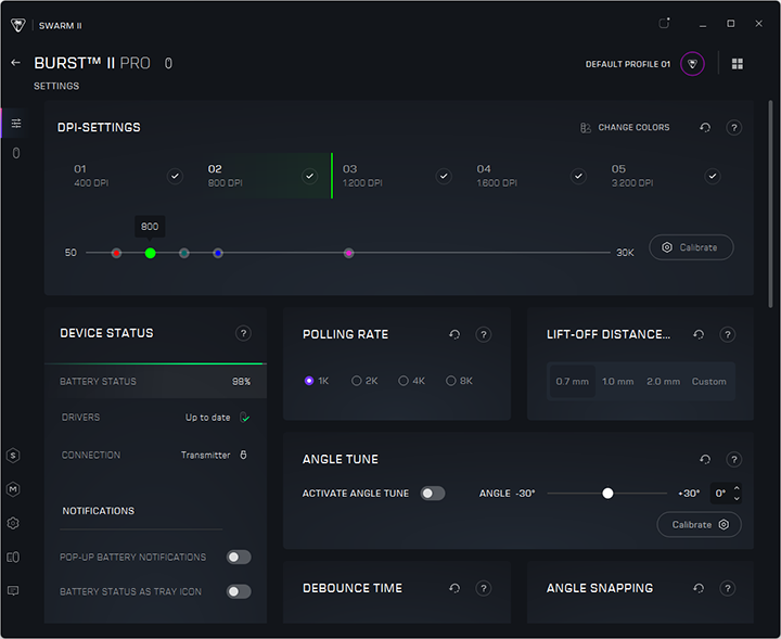 The Burst II Pro works along with the latest version of Swarm II. This program unifies compatible Turtle Beach peripherals into one application. After installing the corresponding device module, you will be prompted to update the mouse firmware. Updating the firmware was a quick and painless process, but it will require the mouse to be plugged in. This is no different than other wireless products I have used.