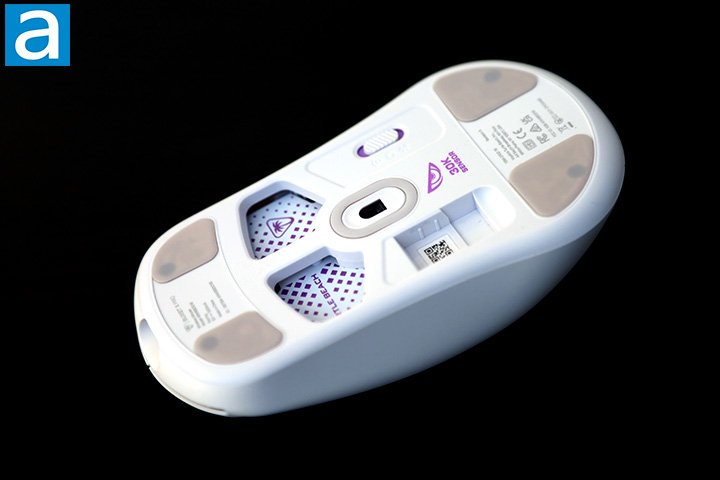A shot at the bottom of the Turtle Beach Burst II Pro optical mouse. One thing that will immediate catch your eye are three cutouts, with two used for weight savings and one to hold the USB transmitter. The tradeoff is they can accumulate dust, so do keep a note for regular cleaning. Keeping the plastic base gliding above your mousing surface are two heat-treated pure PTFE feet, which is also known as Teflon to the common person. In organic chemistry, ethylene/ethene indicates a carbon-carbon bond with two carbons and a double bond (C2H4). Tetrafluoro replaces four hydrogen atoms with fluorine atoms, making it C2F4. In non-scientific terms, poly just means a bunch of them linked together.