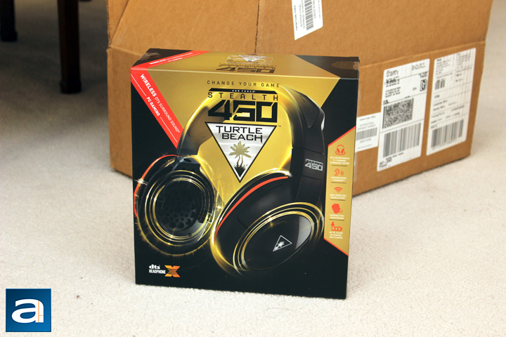 The retail container of the Ear Force Stealth 450 is quite similar to the other two Turtle Beach products we have reviewed here, the Grip 500 and Impact 700. A black and gold coloring scheme is seen here, with red highlights in various places. The front shows the product itself, with gold resonating rings around the product. Turtle Beach's logo is printed in the middle of the box with the product name above the logo. There are several features printed on the side of the front panel, but the biggest feature I should highlight is the fact these are wireless headphones. With a quoted fifteen hours of game usage, we will see if it actually lives up to the tests later on. Otherwise, there are notions of DTS Headphone:X 7.1 Channel Surround Sound, so I will take a look at this in the performance tests.