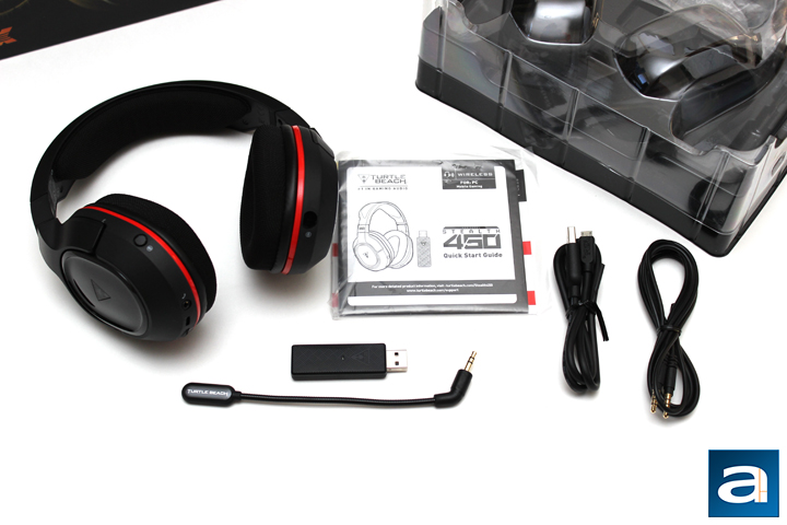 Out of the box, there are a few things to note. First is the Turtle Beach Ear Force Stealth 450 itself. Next is a medium sized USB thumb stick, which serves as the transmitter and receiver interface to your system. A separate microphone module is shown below the USB stick to attach to the Stealth 450. Two additional cables are provided too. The first is a four-pole male to male 3.5mm audio jack, which is used to connect the headset to your mobile device. The other cable is a micro USB to USB 2.0 cable for charging purposes. Finally, a small bag holding some documentation and a logo sticker is included here, but similar documentation can be found online as well. Some notable missing accessories are a carrying pouch, as it would be nice for Turtle Beach to throw in a relatively cheap addition. It would have also been nice to see a second battery here, just as SteelSeries includes with their H Wireless. On the other hand, since the battery is inaccessible to the general public, this omission is understandable. There is nothing much else to look at, so let us turn our attention instead to the headset itself.