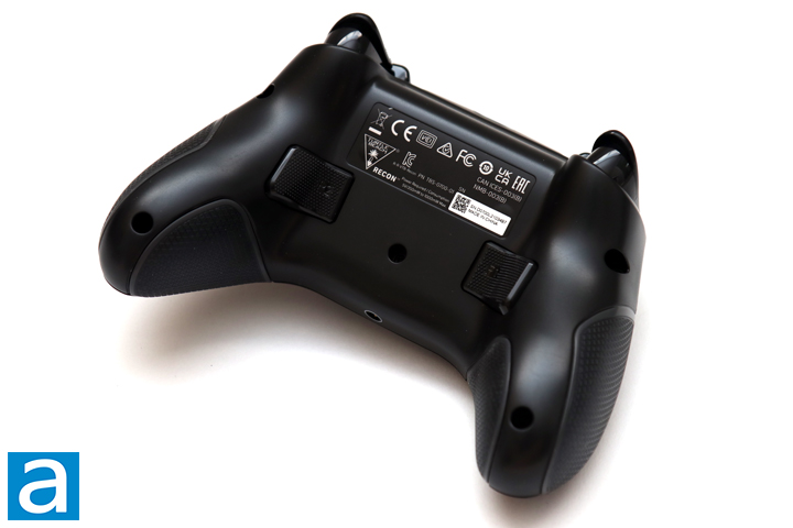 Up to this point, practically everything has been very par for the course and as expected for a standard Xbox controller. However, the first change we see is the inclusion of two more paddle buttons under the Turtle Beach Recon Controller. These two inputs reside right where your fingers wrap around the controller for two more buttons. They have a tactile click with each press and are covered with the same speckled pattern so users can easily identify the paddles. With this, users can activate a Pro-Aim Focus mode. When this happens, it will automatically decrease the sensitivity to the right thumbstick to make it easier to aim. When using a controller, many shooter games rely on the right thumbstick for rotating the perspective, which will aim your gun, so this is a pretty neat feature. In addition, Turtle Beach allows you to remap these buttons to be any other single action on the controller for more user flexibility. While these back paddle-like buttons were originally reserved for the Xbox Elite controllers, it is nice to see this premium feature on the Turtle Beach Recon Controller. Finally, there are some Turtle Beach branding and certification logos on the back label.