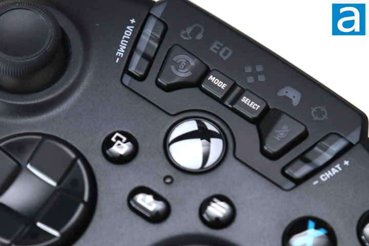 The mode and select buttons are for users to cycle between the four different adjustment modes, as seen on the four indicators above the buttons. The middle diagonal pattern then illuminates to display different levels of each respective mode. The left most mode lets you adjust your own microphone monitoring. The EQ mode provides different Turtle Beach equalizer settings like their "Signature Sound", bass boost, bass and treble boost, or vocal boost. You can also turn it off if you so desire. The controller icon lets you select between four different profiles for button mapping with respect to the back paddles, as you have already seen. Finally, the last mode is where you can modify the Pro-Aim Focus mode, to adjust the tuning of how much you want the aiming mode to reduce the sensitivity. Once again, you can also turn it off altogether. All of these buttons illuminate when the Recon Controller is connected, but the audio specific items only illuminate when you also have a pair of headphones plugged in.