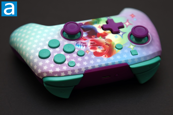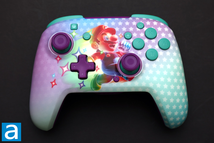 The Turtle Beach Rematch Wireless Controller has a very flashy and attractive design. The Mario in the middle really pops out for its uniqueness. Unlike the first-party Nintendo Switch Pro Controller, this one is much more colorful with its purple and teal color scheme. The background of the Rematch Wireless Controller also shows this same color scheme with a nice gradient between the two colors over a set of white stars. Some may not love the appearance of Rematch Wireless, as it does not necessarily have the same premium feel as the Pro Controller. Mario in the middle is not the sharpest or high-resolution image. Even so, the overall appearance is both unique and eye-catching.