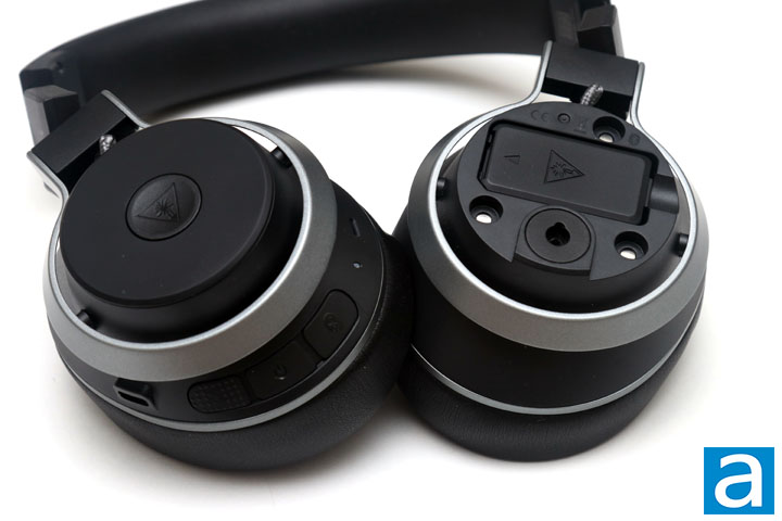 The left earcup shows a few more interesting things. First of all, missing from the photo above is a cover that normally would hide everything underneath here. Instead, you can see the battery pack. Turtle Beach has included two of these batteries so you can swap them out on the fly without any disruption to your gaming. Underneath the battery, you can see a large hole, and this is where you can attach the included boom microphone. One neat thing that has been implemented is the fact you can still mute your microphone by swinging it up. This is because this plug integrates a swiveling switch that will mute in the upright position. On the other hand, if you do not want to use a boom arm, you can also rely on the two mics built into the headset itself. We will explore how well these capture sound later on in our review.