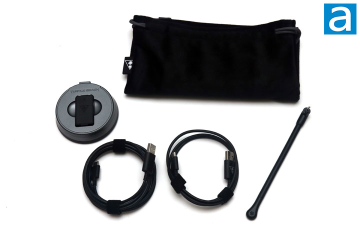 As for accessories, you can see everything that is included out of the box with the Turtle Beach Stealth Pro. Starting from the left, we have the transmitter and battery charger combination pod. This plugs into your console or PC and works to transmit sounds to the Stealth Pro. At the back of the puck, there is a USB Type-C port to plug into your intended system, switch to choose between the Xbox or your computer, and a USB port for charging only. At the top, you can see the second battery slotted into its charging location. Finally, there is a translucent ring around the transmitter. This lights up based on the different pairing statuses and the charge of the docked battery. It also changes color when the microphone is muted.