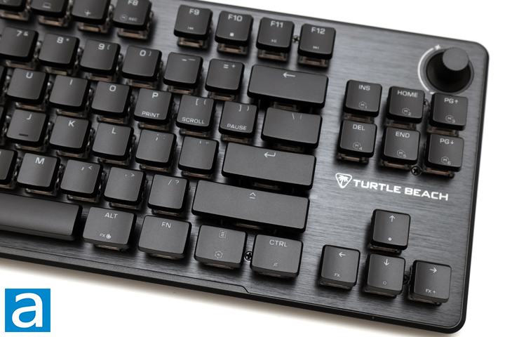 Most people would expect a tenkeyless keyboard with a typical QWERTY ANSI layout like the Turtle Beach Vulcan II TKL to have eighty-seven keys, but it has three less at eighty-four. This is because the functions of the top three keys are implemented with secondary functions. In its place, a notched knob is used to quickly adjust the volume by turning or toggling mute by pressing down. Otherwise, the rest of the keyboard is as standard as they come. The bottom row is spaced out in a typical fashion, with the Windows, Fn, Ctrl, Alt, and Menu keys all being the same 1.25U size on both sides of the space bar. The indicator LEDs are located on the keys themselves. In this case, when it is active, it will breathe in a white pattern compared to the rest of your keyboard. This is an improvement on constant white illumination, as it gives a more distinct indicator when this is active.