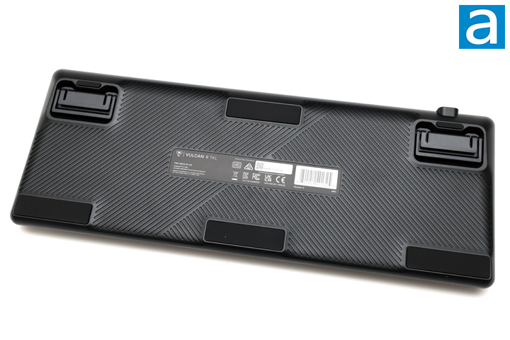 Flipping to the back side, you can see the label with some certification information and a serial number to identify your Turtle Beach Vulcan II TKL. At the back of the keyboard on the left side is where the detachable cable connects. This end is terminated with a USB Type-C input. The included detachable cable measures approximately 1.8m in length and is decently flexible. Otherwise, there are rectangular rubber pads on the edges, with six in total, to keep the keyboard in place. The rectangular rubber pads at back are on the extending feet that raise this keyboard. There is a pair of feet on each side, so you can raise the back to two distinct levels. All the feet are capped with rubber to ensure the keyboard stays in place regardless of whether the keyboard is propped up or not.