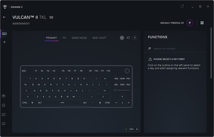 Once you select the Vulcan II TKL from the main page, you will see the entire menu is organized into one long page. On the side, we have two primary sections. The first section is called "Assignment", which is where you can map the keys based on the mode you are currently in. This includes the default "Primary" mode, "Fn" for secondary functions, Game Mode, and Easy Shift. One interesting thing Turtle Beach has implemented is under Game Mode and this is called "ReacTap". This is commonly known as SOCD, or Simultaneous Opposing Cardinal Directions, where you can press two keys at once and it will automatically activate the last key pressed. This is meant to help with strafing and peeking in shooter games. Every time you activate this, Turtle Beach will flash a warning to show this may be banned in competitive games like Counter Strike, as this sort of advantage constitutes cheating and may result in an account suspension. As always, use these things at your own risk.