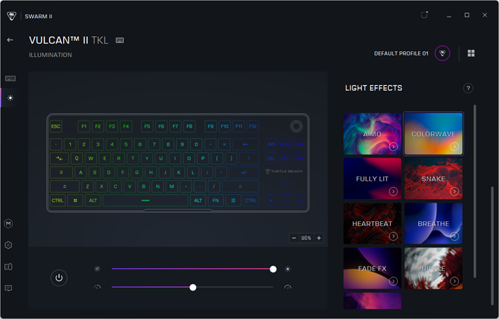 The second page is called Illumination, and this section is used to adjust the lighting effects. We have a typical set of static and dynamic modes, as well as the AIMO mode for a neat gradient pattern that changes over time. Depending on the mode, you can change the color and speed of the effect. Underneath, there are menus to create Macros for use when you remap your keyboard. In the cogwheel marked menu, this opens settings to update the software for Swarm II. Next, there is a Device Manager page to update the firmware for the Turtle Beach Vulcan II TKL. Overall, the software is usable. There were a few hiccups along the way, but Swarm II worked as expected.