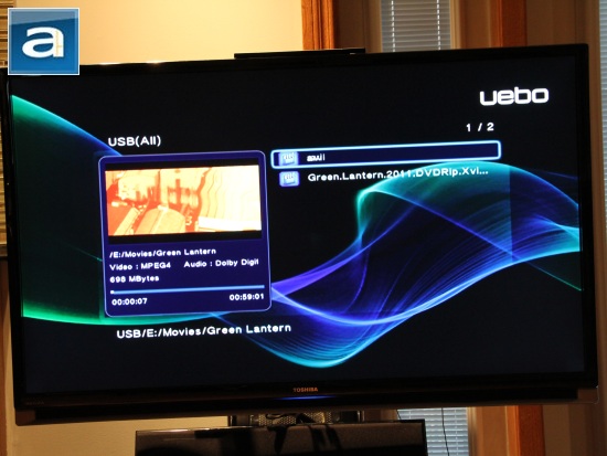 Once the first icon in the startup menu is selected, it will bring you to the video library. In this branch, it allows you to navigate through your favorite video files and playlists. It is important to note when viewing any file (Image, video, or audio), you can view them using all three methods. By pressing the "Menu" button on the remote, one can choose to view their files as a list, thumbnail, or preview. These three viewing options definitely make it easier to find a specific video file, or when you are deciding on the spot what you want to watch. At the same time, the preview option allows users to get a glimpse of the selected video file, nifty. In this screen, however, I found a few hiccups that should be addressed. The preview always starts from the very beginning of the video, and that's not very useful. I also found that there is quite a lot of wasted space. The menu seems to only be situated in the middle of the screen, but does not take up that much room. The rest of the outer edges are just part of the background image, and seeing so much background is sometimes very annoying. Increasing the overall menu size will not only score more aesthetics points, but will clear up a few smaller issues. First off, longer movie titles will not need to awkwardly scroll slowly for you to read. Secondly, the extra display room may allow more files to be displayed, increasing efficiency when finding files. This problem is quite frequent around the entire user interface, and increasing the menu space is definitely a solution. According to the technical specifications list listed before, the UEBO M100 supports the following video file formats: AVI, MPG, DAT, VOB, DIV, MOV, MKV, MPEG, TS, MTS, M2TS, RMVB, WMV, ISO, IFO, MP4, FLV, TP and TRP. This is quite a hefty list, and throughout my tests, I was able to play a large variety of the most popular video formats without any issues.