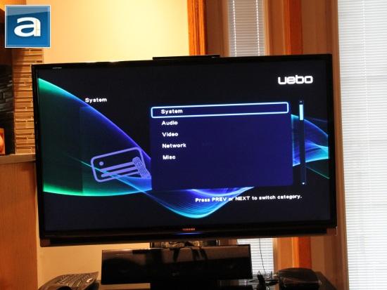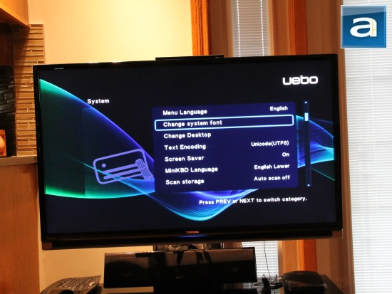 After pressing "enter" over the system icon, you will be taken to a small sub-menu that focuses on changing your system settings. In this menu, you can change a wide variety of options, including your video, audio, and personal settings. The screens itself are fairly plain, and will only provide a few changes over the system. It is suggested that all reformatting of your drives should be done by the UEBO M100 on your TV and not your computer. Other crucial elements found in the system menu would be the language options, as well as the system restore options. The 'scan' feature on the M100 is not to scan the hard drive for viruses or spyware. Instead, it is used to index your storage device for all your video, image, and music files, and to compile a list into the under each icon found in the main menu.