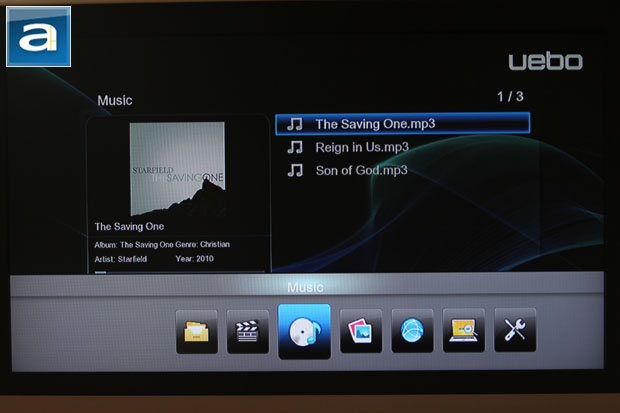 The music playing is the same as the video selection menu in Preview mode. You will still get the same file list on the right, but the video preview window now displays album art and ID3 tag data of the song. Supported file formats include MP3, OGG, WMA, WAV, AAC, and FLAC. Unfortunately, you cannot sort songs by album, artist, or genre and whatnot; it just shows everything in one long list. In other words, if you have more than three songs like me, then it will be an organizational nightmare, haha. Also, I'd much prefer the file menu to show the song's ID3 title tag rather than the file name. A separate screen for playing music will also be appreciated -- the new screen should have a bigger album art display, more prominent ID3 tag listing, and maybe visualizations as well. As far as what we have right now, yes, I totally agree that it does the job just fine, but as a home entertainment device, I am sure users are looking for the overall experience too, and not just function.