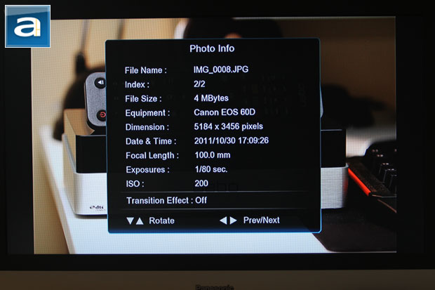 Normally, I don't even bother going into the Pictures of digital media players, mainly because there is nothing interesting enough to talk about for it to have its own paragraph. However, the UEBO M400 does -- for more than one reason. For one thing, you can play music during a slideshow. Secondly, the UEBO M400 can actually show EXIF data if you hit "INFO" (Notably missing is aperture size though), as demonstrated in our image above. The slideshow timing and transition effect can also be modified by the end user, but if you prefer to show each picture one by one, manual scrolling works just as well. You can also hit the Zoom button on your remote to highlight individual parts of your photo. Common file formats such as JPG, BMP, GIF, TIF and PNG are supported by the M400. It is enough for most users, but if you shoot with a dSLR camera and you use RAW, then you will need to convert it to any of the above first before plugging in your SD card.