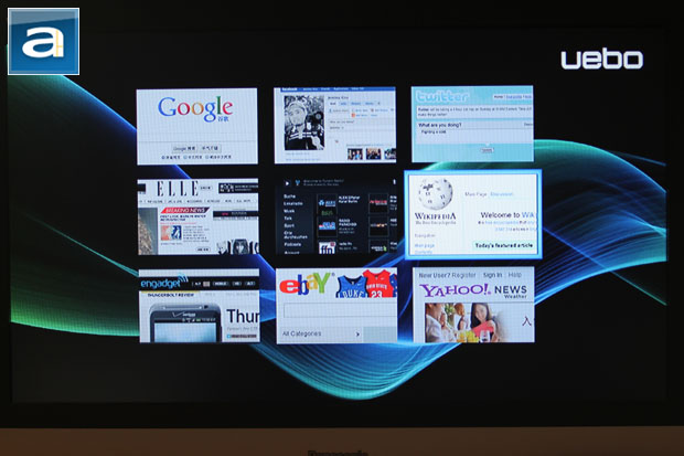 The feature I do want to talk about in particular is Internet Browser. I agree it is really cool to have an internet browser capable network media player, but there are some real flaws with it. Firstly, I'd like the tiles of the default bookmarks to be live, rather than random homemade-like snapshots. Secondly, you cannot change the default bookmarks at all. Basically, you are stuck with, from left to right and top to bottom, Google (With a Google China screenshot), Facebook (Of Jemima Kiss), Twitter (Of someone tweeting about fighting a cold), Elle (With an article titled "First Look: Marilyn Minter Retrospective"), Amazon (No idea how they got that screenshot), Wikipedia (The only one that looks normal and neutral), Engadget (Now featuring a Verizon Thunderbolt review), eBay (Anyone want some basketball jerseys?), and Yahoo! News (No idea what is going on). I don't even go to half of those websites on a regular basis, and there is absolutely no reason why I cannot customize any of them.
