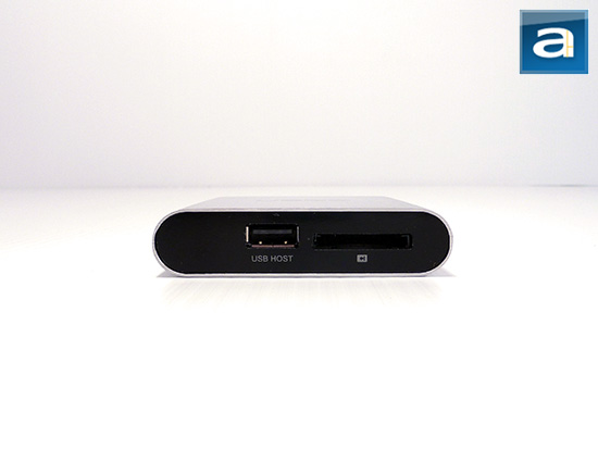 So what do you put on the front of a tiny media player? Well, the ports, obviously. The UEBO M50 has all of the external storage ports on the front. The first one is a USB 2.0 port on the left side, with a label indicating it is a USB host port. The other one is the card reader on the right side, marked at the bottom with a label showing a card symbol. It is very clean and plain front panel, but nothing to complain about here. It keeps things super simplistic for the end user. To the left side, there is also the power LED indicator, which is blue during normal usage; however, this is not visible in the image above, because the M50 isn't plugged in. The card reader offers support for SD, SDHC, and MMC cards, which is very convenient if you want to plug in your SD card directly from a camera. When it comes to the front, it offers all the basics of what you need, and leaves everything else behind.