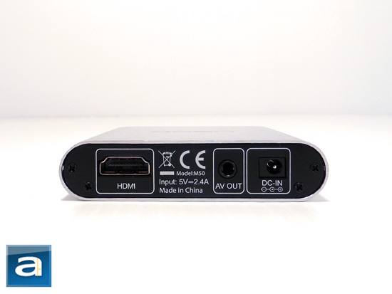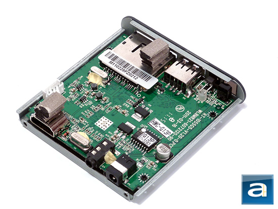 The back side isn't that much different from the front, other than white lines outlining the ports, and electrical information written beside the display ports. Starting on the very left, you can see the clearly labeled HDMI connector. The next port is A/V out; used for composite video/audio. Finally, on the right side is the power port, which is labeled as DC in. This keeps things very simplistic, and nothing is unclear about which port is to what. My only complaint is that it has no S/PDIF output, so for carrying the digital signal, you are limited to HDMI only. If you haven't guessed by now, the whole unit is passively cooled. During use, it gets does get warm, but not to the point that it would be unpleasant to pick up. In addition to the ports on the back, you can also find four screws. These hold the internal components of the media player to the metal exterior. These screws are very easy to remove, but due to their size, they are also extremely easy to lose. (I guess I'm a poet, and I didn't even know it.) (Sorry Devin, I fail to see why. :P - Editor)