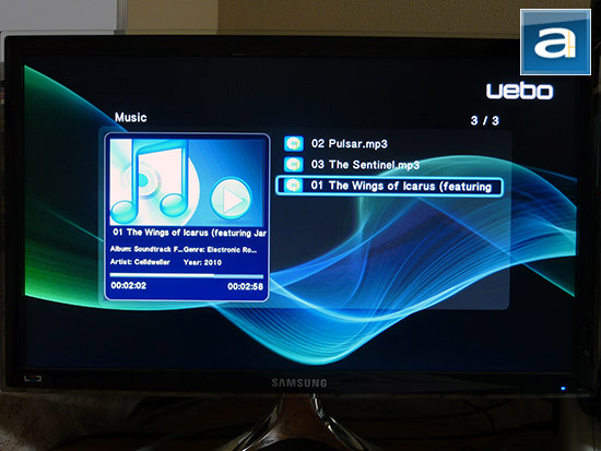 I was not impressed by the simple music player provided by the UEBO M50. This is simply because it was nothing more than a basic playlist with the information about the currently playing audio file. With no visualizations to watch while listening to music, the only thing you are waiting for is the screensaver to turn on and watching the UEBO logo stagger across the screen. Not that it is really a huge deal, as you don't particularly watch the screen while listening to music, but some effort could have been put into making this more interactive and engaging. The size of the text box in the audio description panel is not efficiently allocated. Typically you would instead position the text below each label to maximize space, but the UEBO M50 doesn't offer much screen space for the media information. For file formats you have the selection between the following: MP3, OGG, WMA, WAV, AAC and FLAC. These are typically the main formats for audio that a consumer would have, and if you have any audio files of a different format, you will have to convert them if you want to play them on the M50.