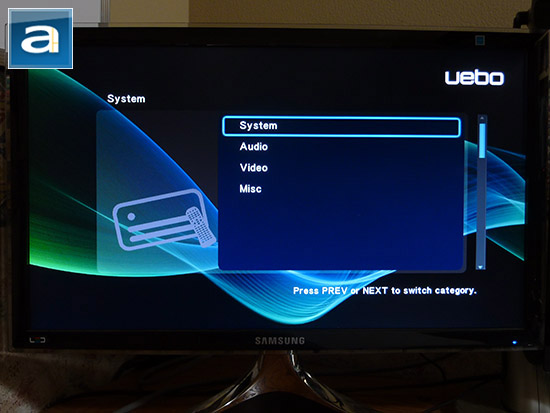 The settings menu is very simplistic and doesn't offer any significant features. Here is where you can change the video and audio settings between different resolutions and modes. The system menu allows you to set the most basic configurations, such as language, system font, desktop image, text encoding, using the screen saver, keyboard language, resume last played position, format device, restore settings and whether or not to scan the storage. By default, scanning is turned off on the UEBO M50, so none of the video, picture or audio menus are populated. This resulted in some confusion when I was first using the device, as none of my files were showing up. The last setting menu option is the miscellaneous menu. This allows you to display the current software version or upgrade from a USB flash drive. Personally, this menu item should be called 'software', not 'miscellaneous', as this really only has to do with the firmware of the system.