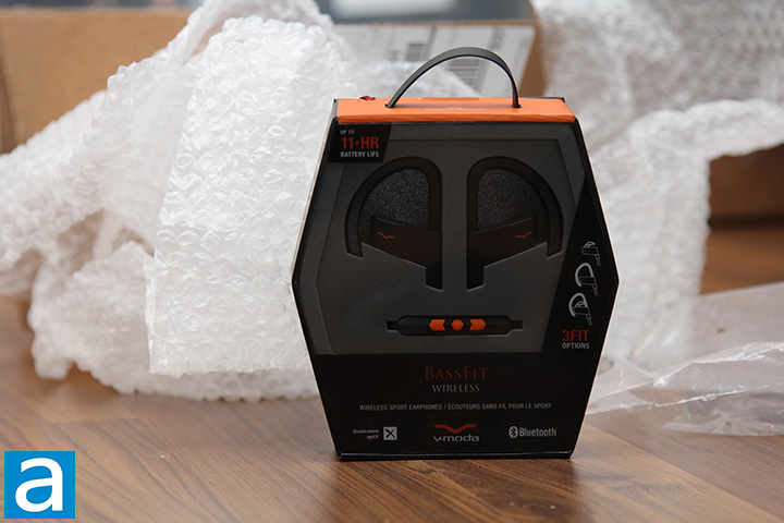 V-MODA has always been a company that is heavy on both style and substance, and this is evident right from the retail packaging. Consistent with the rest of V-MODA's current product lineup, at first glance, the BassFit Wireless's box is conventional in a sense it does not try to be different for the sake of being different. At the same time, it is unconventional in a sense that it is well designed in its unique details. The thick cardboard walls are constructed into a hexagonal shaped box; with colors well-coordinated in a mix of mainly orange and black shades. In front, you will see a both sides of the V-MODA BassFit Wireless in addition to the three-button remote through a window, as you can see in our photo above. Below the window is the product name and the line "Wireless Sport Earphones". Along the bottom edge, we see various logos like Qualcomm aptX, Bluetooth, and V-MODA itself, followed by the three fit options on the right. A tab at the top points your attention to its 11-hour battery life. A rubber handle on top is present for some style, while the inner packaging is sealed by a ribbon you have to cut. Finally, feature highlights, compatibility, and what is included can be found on the remaining sides, along with some specifications.