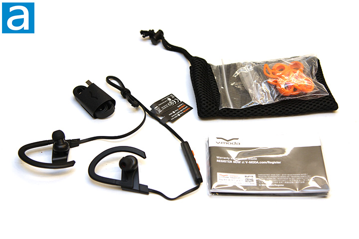 Upon opening the box, you will be greeted by its all black foam padded interior. From a practical standpoint, it protects its contents well. From an aesthetics standpoint, it looks very classy, just the way the company meant for it to be. Out of the box, you will receive the V-MODA BassFit Wireless earphones in front with the some of the accessories in the cavity below. The rest of the accessories are placed in a separate resealable plastic bag. These accessories include two of each of the four sizes (XS, S, M, and L) of Bliss 3.0 fittings for a total of eight sleeves, three pairs of ActiveFlex sport fins in different sizes, two detachable sport ear hooks, portable pouch, USB to Micro USB charging cable, and a user manual. It comes with quite a bit of accessories to accommodate a wide range of user preferences. The portable pouch looks almost exactly the same as the one that came with the V-MODA Forza, and is held closed by a drawstring. Having stuff like an OEM portable pouch is absolutely invaluable for those who plan to take the V-MODA BassFit Wireless out the front door of their house. Not only does it keep your $130 earphones protected, but I also found the case is just as fashionable as the earphones itself.