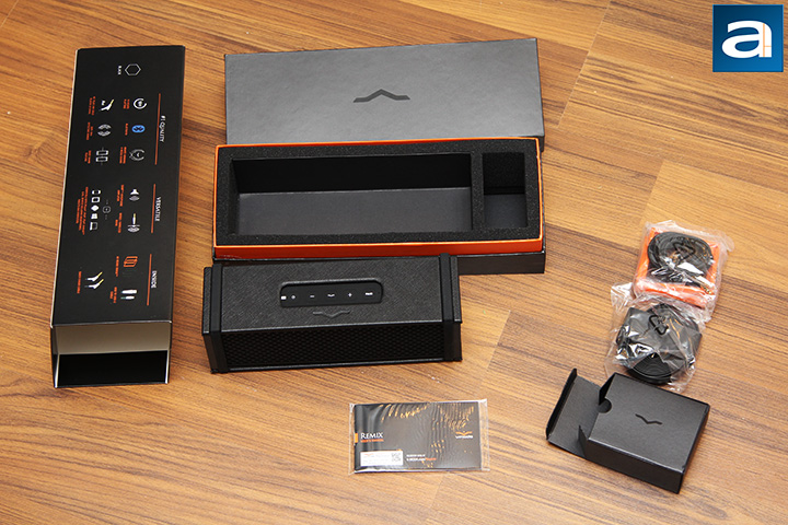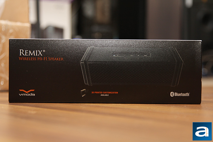 Inside the elongated brown corrugated cardboard box is the retail box for the V-MODA Remix, which, much to no one's surprise, is yet another elongated package. V-MODA has always been a company that is heavy on both style and substance, and with their latest creation, this is evident right from the retail packaging. Those familiar with the company's retail art will immediately recognize the brand here. The thick cardboard walls are constructed into a rectangular shaped box inside an outer wrapping; with colors well-coordinated in a mix of mainly orange and black shades. In front, you will see a photo of the side of the front of the Remix, as you can see in our photo above. The product name and its description, Remix Wireless Hi-Fi Speaker, is located at the top left corner. A small icon is placed appropriately at the bottom to indicate custom printed shields are available. Off to its left is the company's logo, followed by the Bluetooth logo on the opposite side. Finally, feature highlights can be found on the remaining sides.