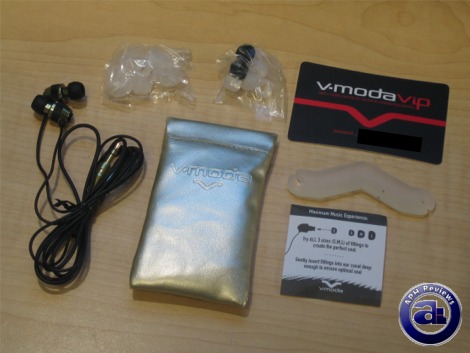 Included Accessories: gold leather pouch, modawrap, six pairs (S,M,L) of clear and two pairs (S) black silicone fittings, V-MODA VIP Card