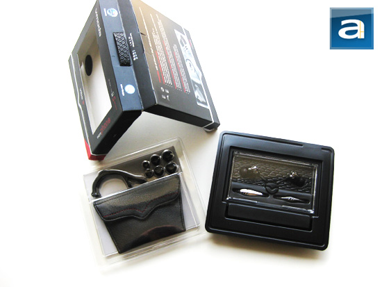 The relatively compact box carries an elegant matte black color scheme, with a neat array of red and white highlights. These colors are used very effectively by the text and graphics. Occupying a large surface across the front is a well implemented cutout as a window to the enclosed transparent plastic case behind. Inside the transparent plastic case are the V-MODA Vibe II earphones themselves neatly aligned and placed to display the actual product in a stylish fashion. The perimeter around the entire box is cleanly designed for an extremely modern look.