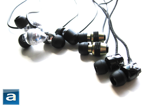 From the left: Shure E2c, Radius Atomic Bass, V-MODA Vibe, V-MODA Vibe II.