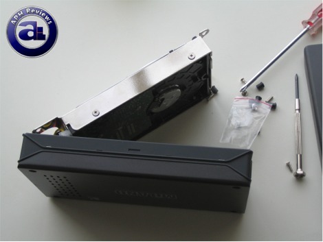 The next step involves placing the hard drive with the attached frame into the Vizo Milano, and aligning it with the screw holes on the enclosure shell and the frame on all four sides. Pop on the the aluminum cover.