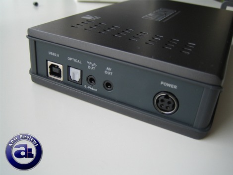 Anyways, back on topic, on one end of the Vizo Milano are the input/output connectors. From the left is a USB 2.0 connector, followed by an optical out, 3.5mm S-Video/component video out, 3.5mm composite video out, as well as a power input. Video out cables are included for the semi-proprietary 3.5mm video outs; but we would actually like to see standard connectors instead -- at least a short leadout would be nice since some users may prefer higher quality cables.