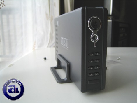 On the other end are the controls. At the top is a power button with blue LED that not only indicates power status but also blinks with disk activity; located below is the remote signal receiver. An array of eight buttons are located below it for basic on-screen navigation and usage.