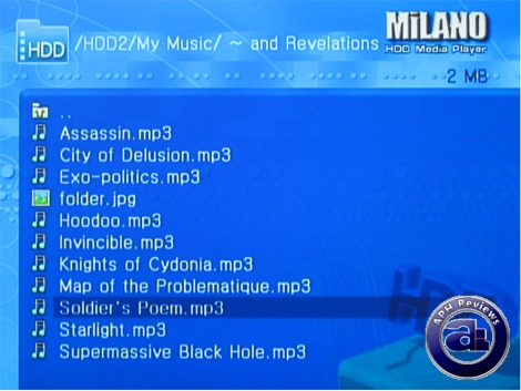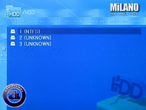 Finally, I took a Seagate 7200.7 160GB from one of my spare computers and plugged it in. The Vizo Milano came to life and had no issues at all; a brief moment displaying the Milano logo as the device initialized. When loaded, the screen above is shown -- since the drive is partitioned into three NTFS volumes, they are shown correspondingly in the screen above.