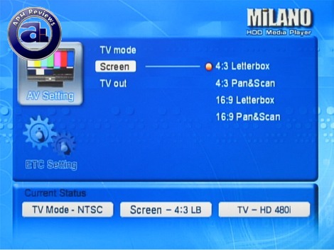 Hitting the Setup button on the remote control brings the Vizo Milano to the setup screen. The first group of settings are formatted under "AV Setting"; where TV mode (PAL/NTSC) are configured along with screen aspect ratio and resolution configuration. The current settings are conveniently displayed at the bottom.