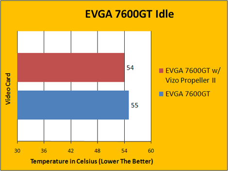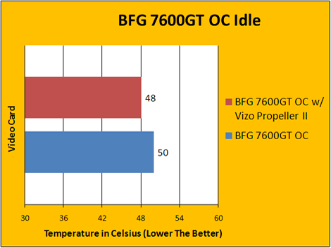The eVGA 7600GT by default runs hotter than the BFG 7600GT OC in my system, because it is an older model. The BFG 7600GT OC is the newest revision that's designed to be more effectively cooled. The eVGA 7600GT which was directly below the Vizo Propeller II did not improve by much, with a decrease of only 1 degree. Keep in mind though, that the bottom of the Vizo Propeller II is also covered by the aqua colored plastic, and has no openings to allow for heat to enter when heat rises.