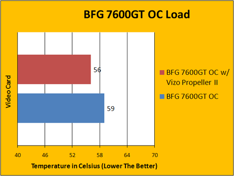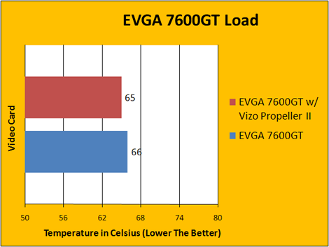 Finally we have our load test on my eVGA 7600GT, which resides below the Vizo Propeller II. Again, we only notice a 1 degree drop since the bottom is completely encased and has no direct entrance for hot air. This means that the Vizo Propeller II is effective in cooling the graphics card that is above it, since the heated air is easily exhausted by the 65mm fan.