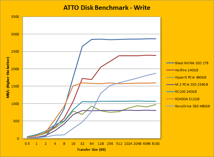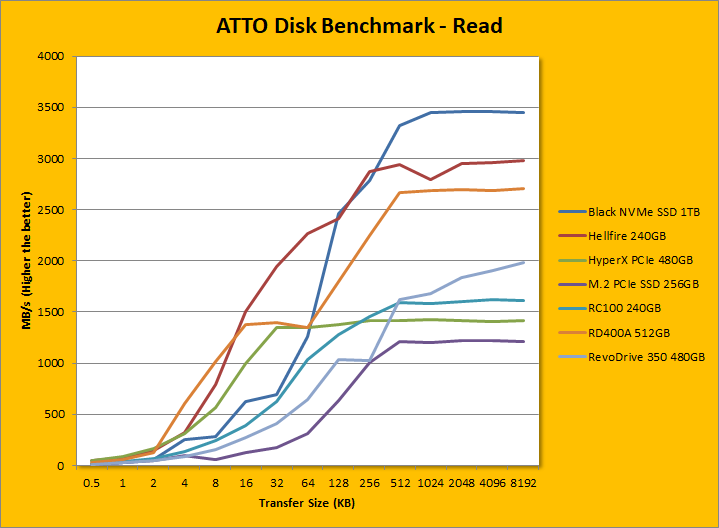 Following up next are our usual ATTO read and write tests. ATTO is an often-quoted benchmark, because it is easy to use and accurate. For the most part, it is a favorite among reviewers, and I have grown to embrace it as much as the next for the last little while. ATTO uses easily compressible data, so compression-heavy controllers will perform very well here; as far as the Western Digital controller is concerned -- well, here are our results. As manufacturer peak read and write performance ratings are usually achieved using ATTO, whether a drive lives up to its marketing claims or not can be validated by this program. Western Digital claims the Black NVMe SSD 1TB's maximum read and maximum write are pinned at 3400MB/s and 2800MB/s, respectively. According to our tests, these numbers were slightly underrated. It peaked at 3456.125MB/s read and 2864.199MB/s write. Under the curve, its write speed was slower than the RD400A and Hellfire M.2 until 4K, where they were eclipsed by the Black NVMe. We can see a similar pattern as we move into the read graph, except the Hellfire held on until 256K. At 512K or higher, the Western Digital Black NVMe SSD 1TB ran away to be the fastest SSD in ATTO we have ever tested here at APH Networks.
