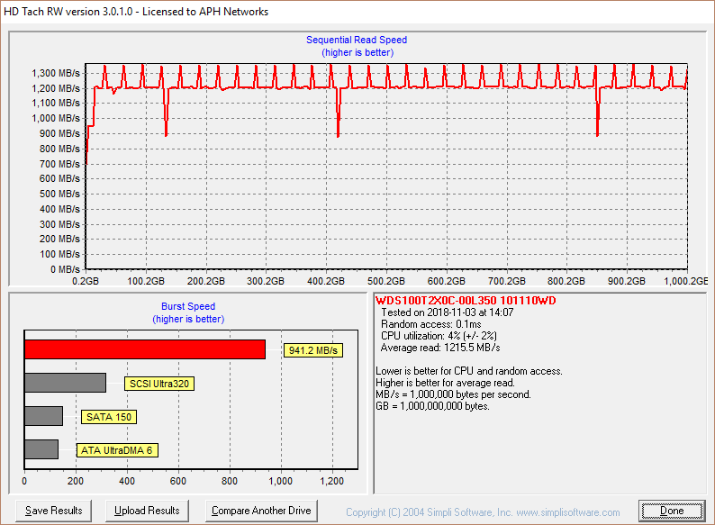 After giving the Western Digital Black NVMe SSD 1TB a clean format and ensuring alignment and everything is correct, I fired it up for some testing in HD Tach. While HD Tach is more of a drag race than a clear indication of real life performance, and has been around for a really long time, it is an excellent storage performance reference among SSDs with the same controller and has been our favorite benchmark long before hard drives even cracked the 50MB/s mark. With an average read speed of 1215.5MB/s according to HD Tach, this score simply crushed the previous record holders by a decent margin. The Patriot Hellfire and OCZ RD400A of the previous generation came in at 1107.5MB/s and 1109.7MB/s, respectively. For most solid state drives, we typically look for something that is faster than 350MB/s. From our experience, most drives do not crack the 400MB/s line. At the end of the day, HD Tach may not be the best test for solid state drives all the time, but these results are always interesting to look at.