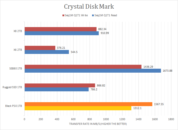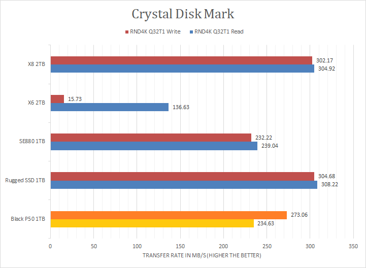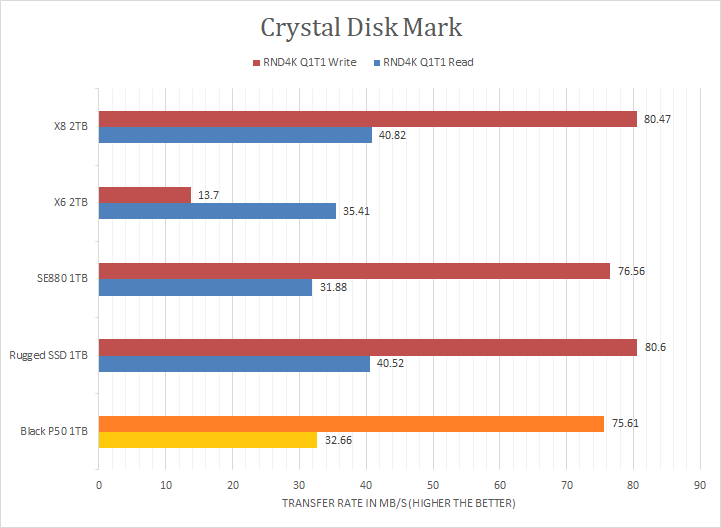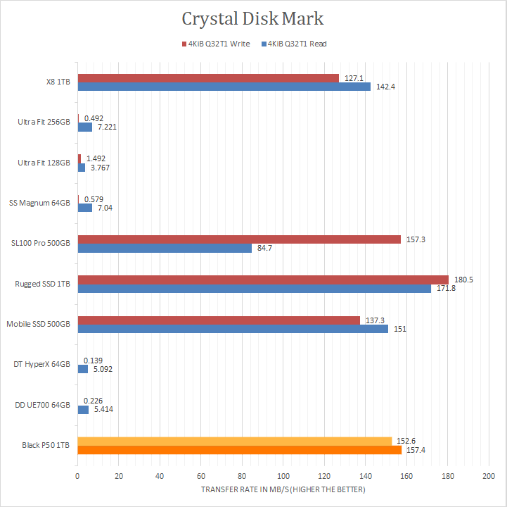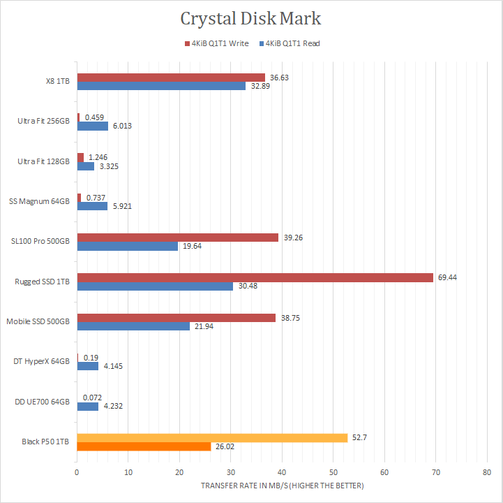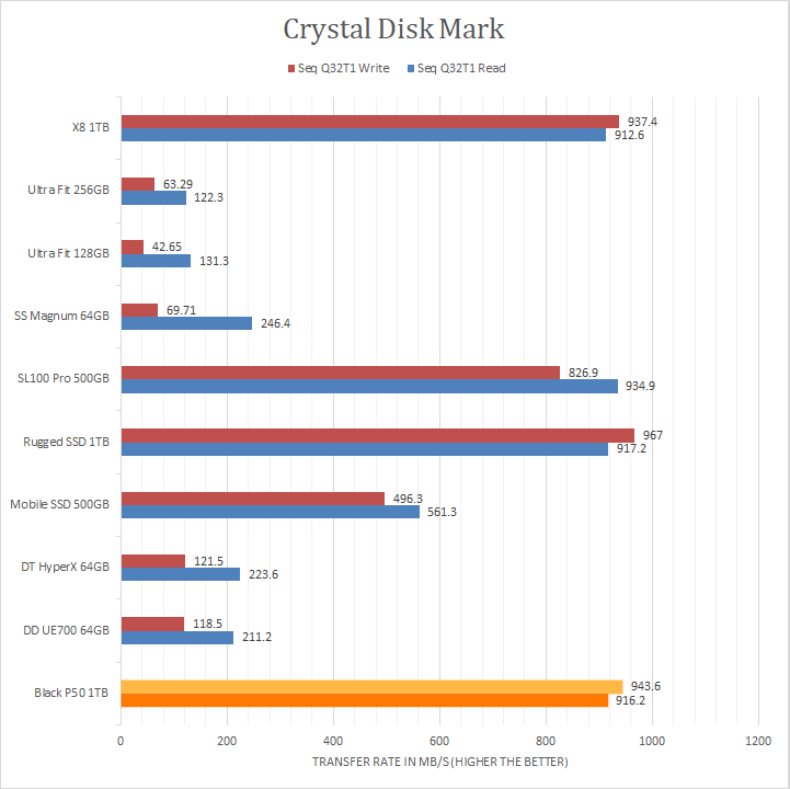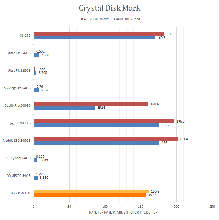 When it comes to Crystal Disk Mark, the Western Digital Black P50 Game Drive SSD 1TB generally delivered favorable results. This is not too surprising considering its solid numbers we have already seen so far, especially with the NVMe solid state drive inside. Its sequential read and write speeds max out at 916.2MB/s and 943.6MB/s, though these are slightly lower than what we got from ATTO. Moving to the other tests, which require high input/output operations or IOPS, the Black P50 Game Drive SSD 1TB was in the middle of the pack compared to other external SSDs, and remained mostly competitive to drives like the Crucial X8 1TB and the Lexar Professional SL100 Pro 500GB. In the read and write tests of 4KiB Q8T8, 4KiB Q32T1, and 4KiB Q1T1, the Black P50 Game Drive SSD had mixed results, with it continually trading blows with the Crucial X8 1TB and generally beating out the Lexar option. However, the LaCie Rugged SSD 1TB dominated all of these drives in all of these tests. Compared to the rest of the USB drives, these tests have always been a weak point for USB flash drives and a strong point for solid state drives, as we can see here.